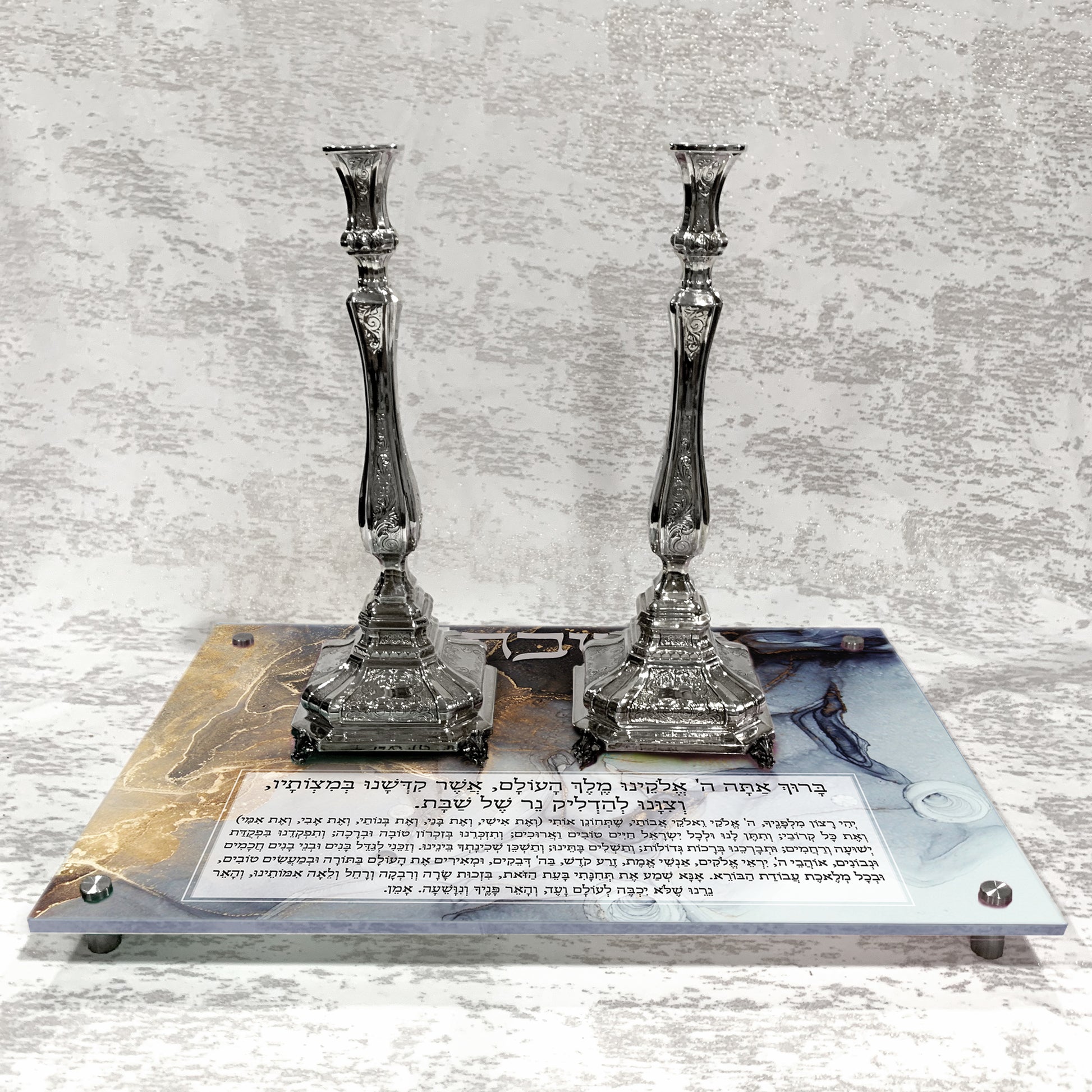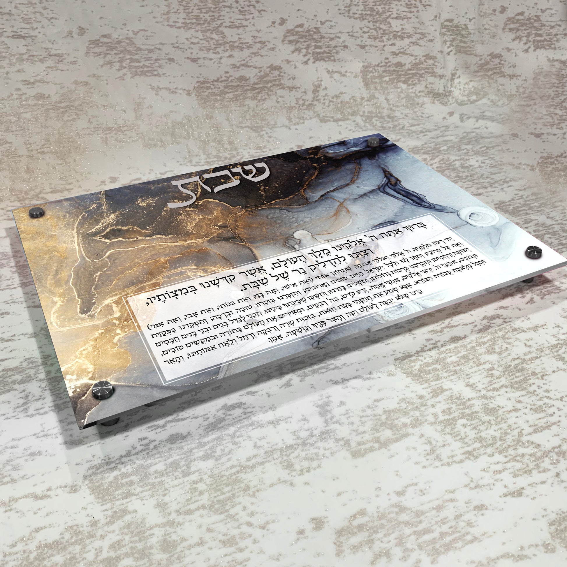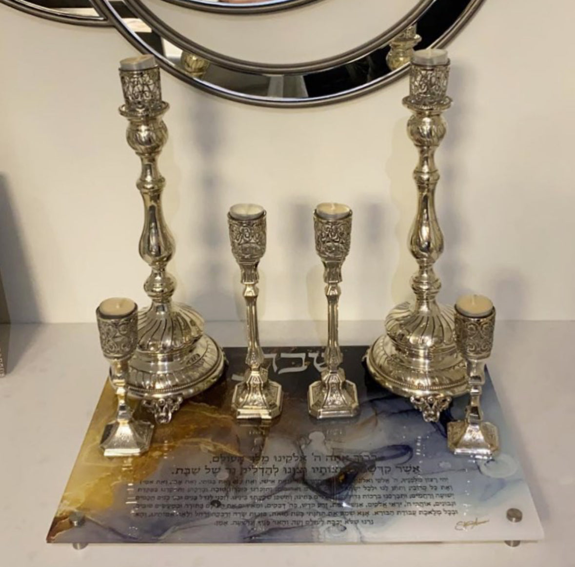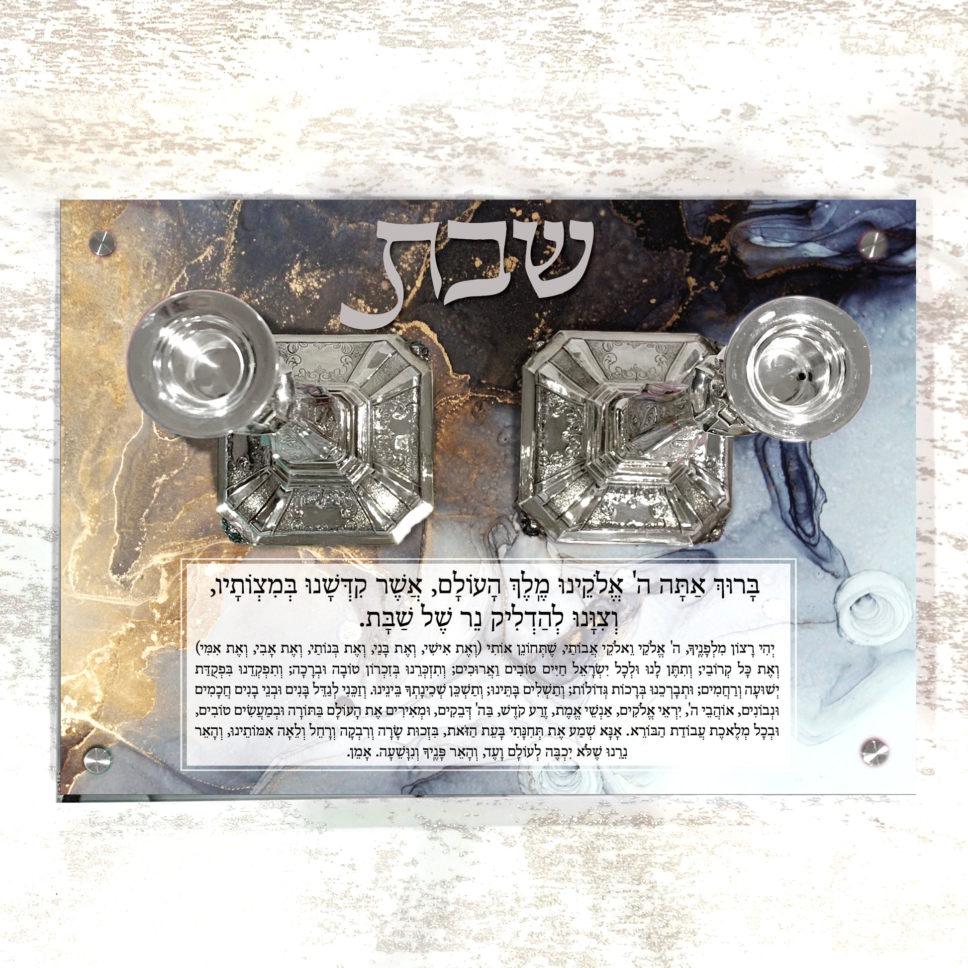 Your candlesticks will look beautiful on any of these designs printed on acrylic to enhance your Shabbat. Contains the text of the brachot and yehi ratzon said after candle lighting.